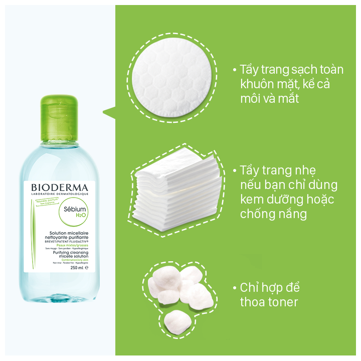 Bioderma đã đem tới giải pháp micellaire: sử dụng các hoạt chất tẩy rửa siêu nhỏ (hạt micelle) để lấy đi các bụi bẩn, tế bào chết, mỹ phẩm trên da, mà không cần dùng tới các chất tẩy rửa hay được sử dụng như chất xút (xà phòng) hoặc các chất tẩy rửa thuộc nhóm sulfates. Chính vì vậy, Nước tẩy trang BIODERMA Sébium H2O xanh 500ml giúp bạn có thể tẩy trang mà không cần rửa lại với nước, bạn chỉ cần thấm vào bông tẩy trang và lau sạch mỹ phẩm là được. Rất thích hợp với những cô nàng “lười”.