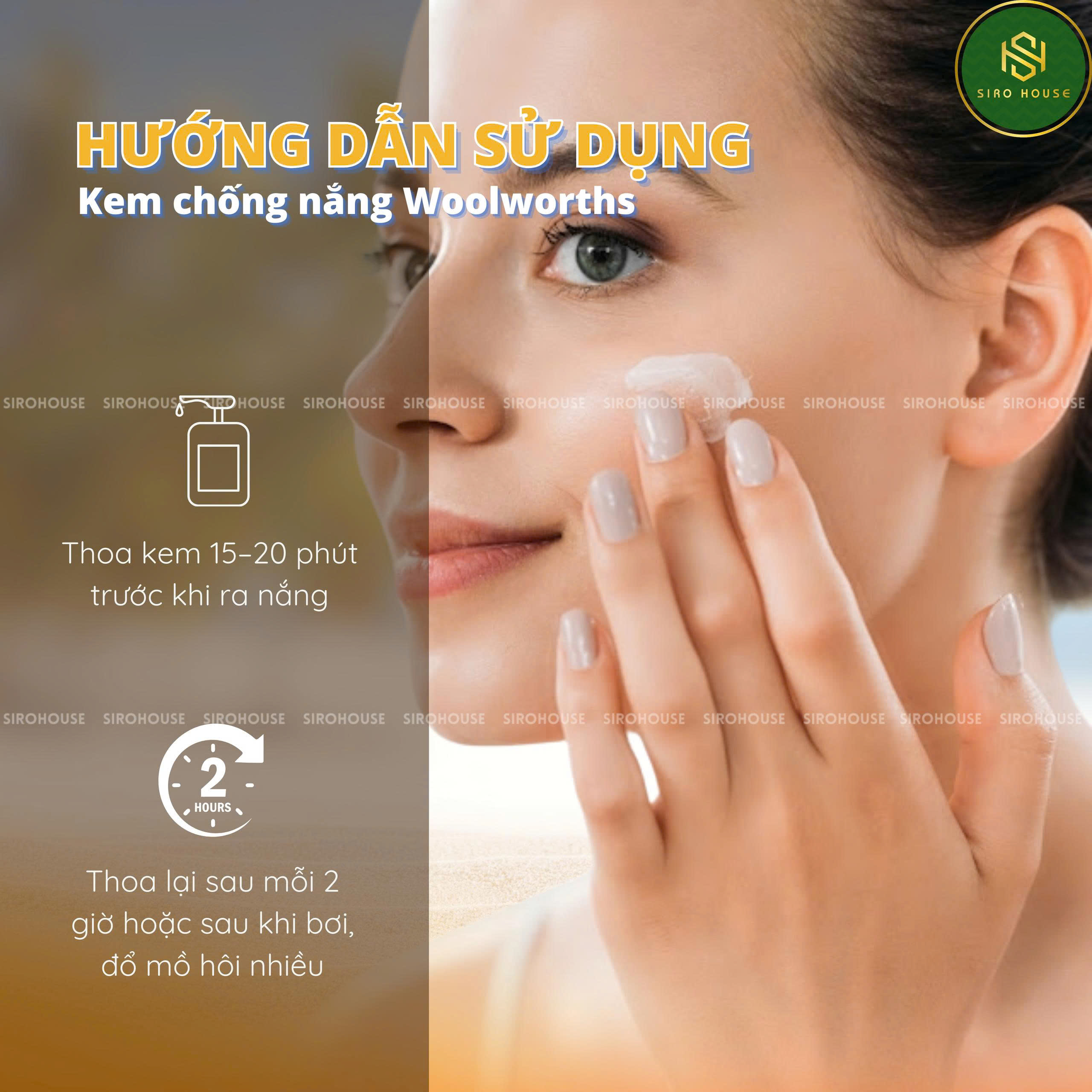 Thoa một lượng vừa đủ lên da 15–20 phút trước khi ra nắng.