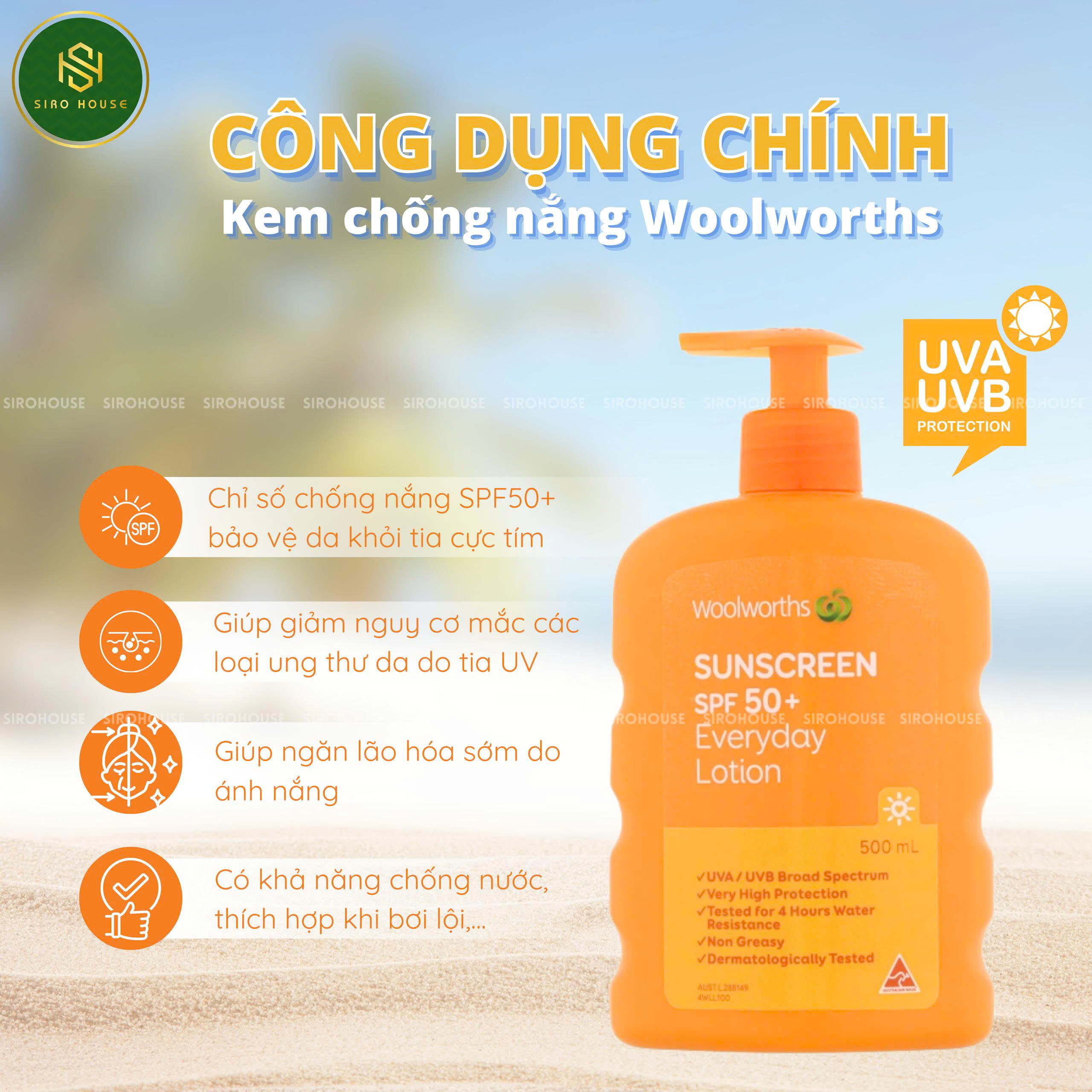 Kem chống nắng WOOLWORTHS Everyday Lotion SPF 50+ là sản phẩm chống nắng phổ rộng giúp bảo vệ làn da khỏi tác hại của tia UVA và UVB – nguyên nhân chính gây sạm da, lão hóa và ung thư da. Với kết cấu dạng lotion mỏng nhẹ, sản phẩm dễ dàng thoa đều, nhanh thấm và không gây nhờn rít, mang lại cảm giác dễ chịu khi sử dụng hằng ngày.