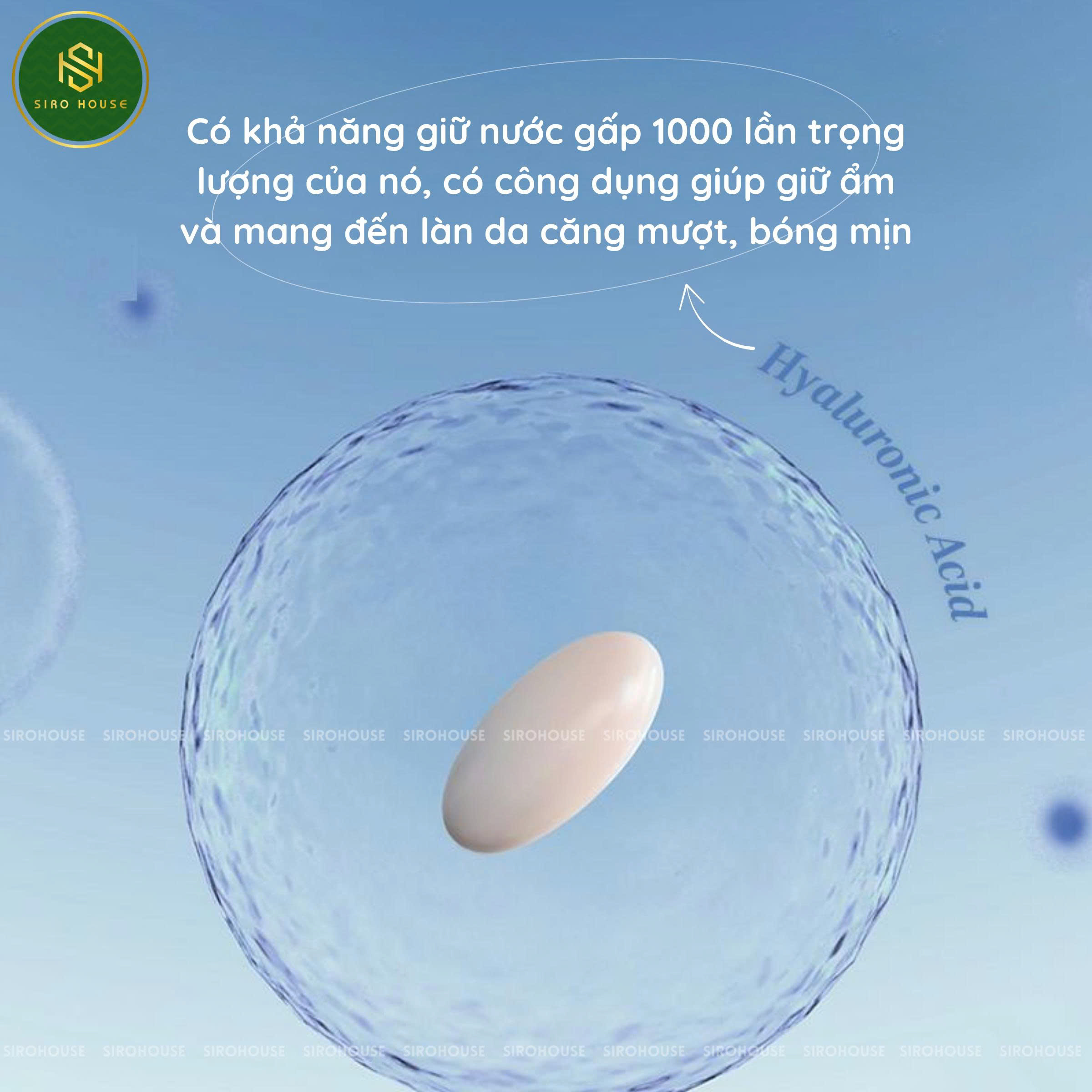 • Sodium Hyaluronate (Hyaluronic Acid): 240mg/2 viên, giữ nước gấp 1000 lần, cấp ẩm sâu cho da trung bì.