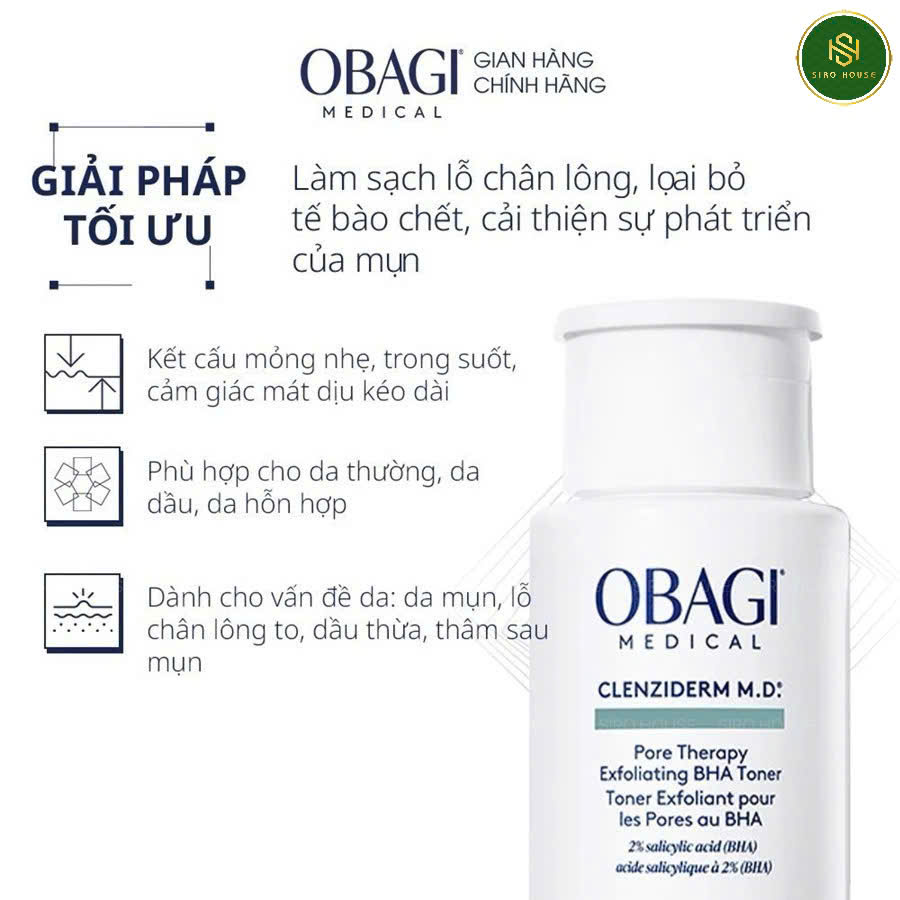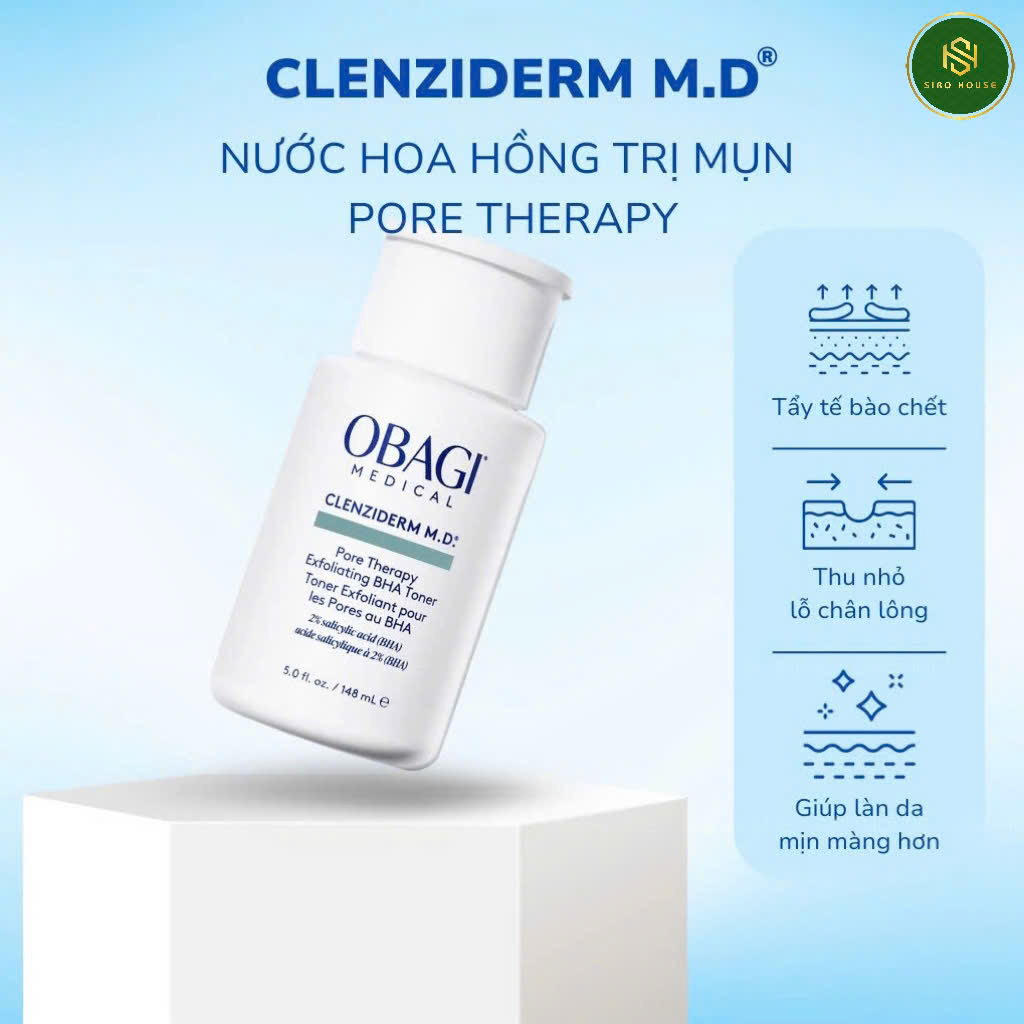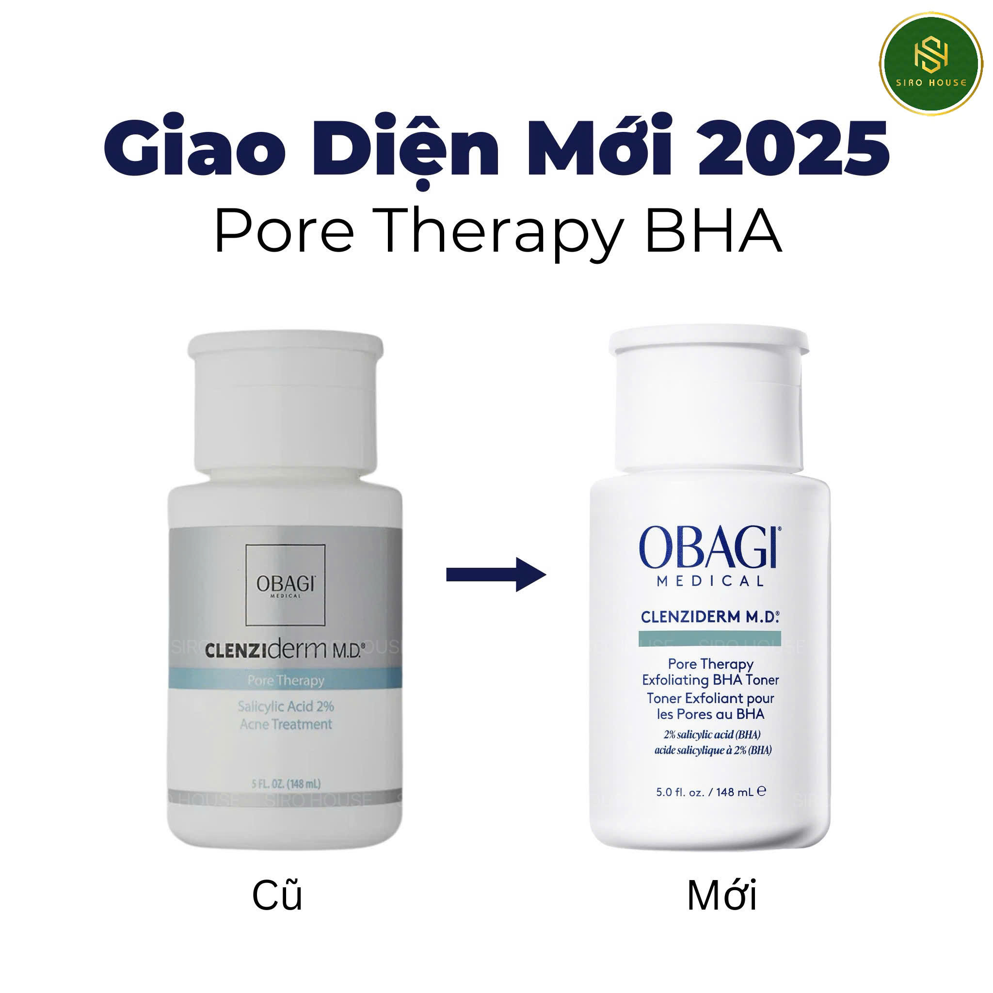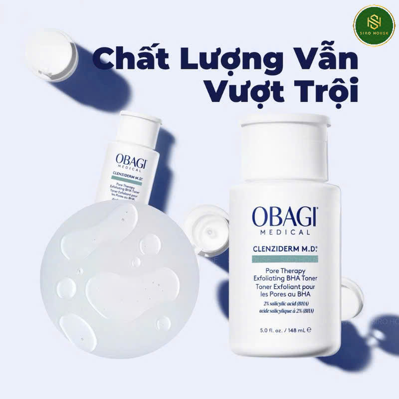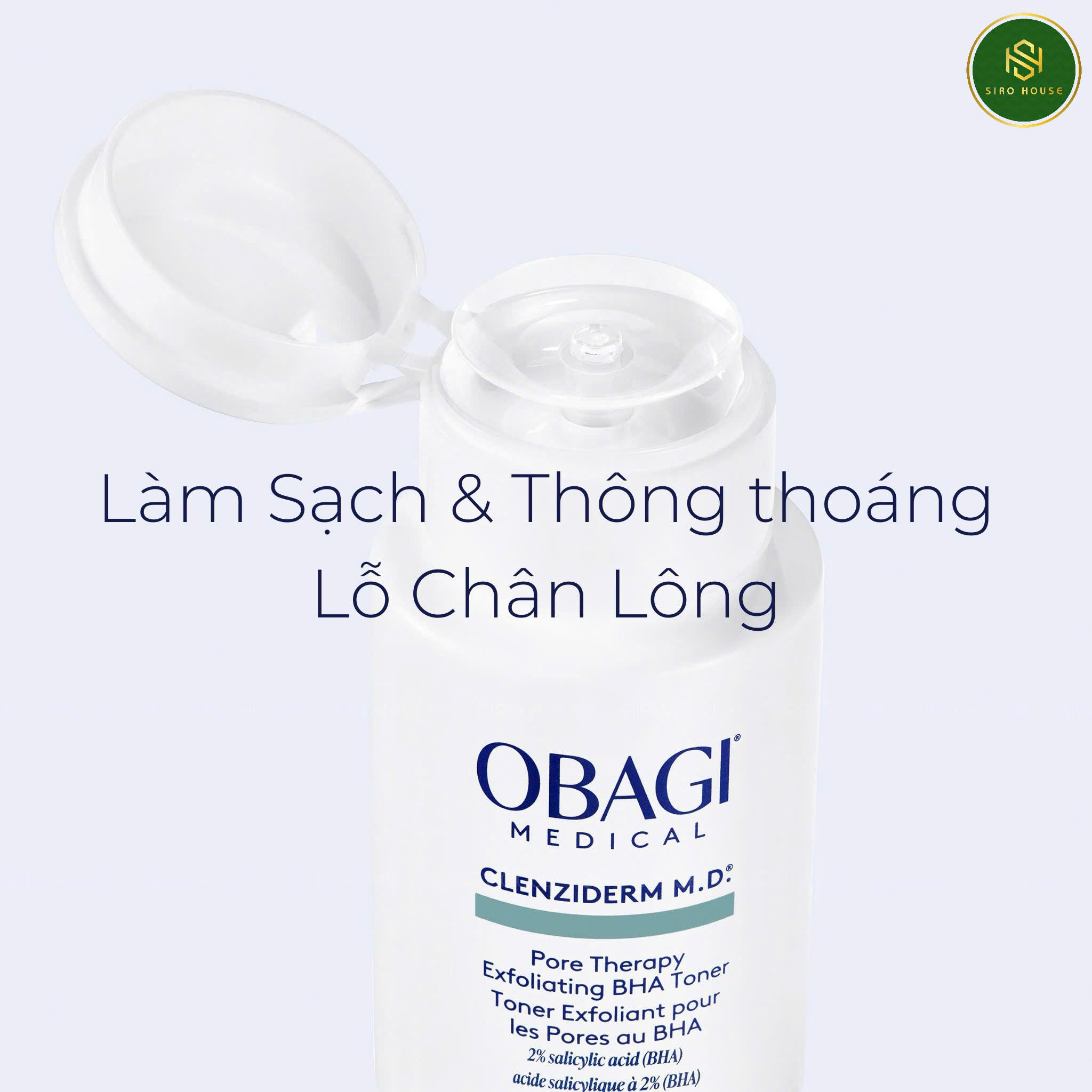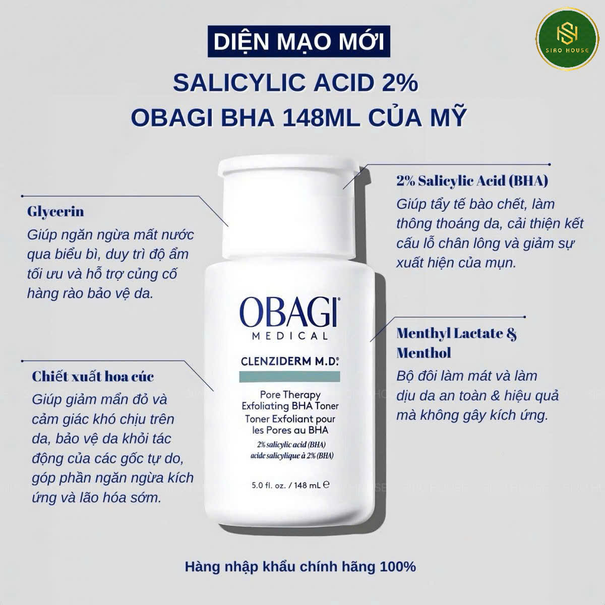 Dung dịch tẩy tế bào chết OBAGI Pore Therapy Exfoliating BHA Toner 148mL là toner chuyên trị mụn và làm sạch lỗ chân lông từ dòng CLENZIderm M.D.™ của Obagi Medical, thương hiệu da liễu hàng đầu Mỹ. Với nồng độ 2% Salicylic Acid (BHA), sản phẩm thấm sâu vào lỗ chân lông, loại bỏ tế bào chết, bã nhờn thừa và bụi bẩn, giúp da thông thoáng, giảm mụn và thu nhỏ lỗ chân lông. Kết cấu lỏng trong suốt, không màu, mang lại cảm giác tươi mát, phù hợp cho da dầu, mụn, lỗ chân lông to hoặc da hỗn hợp. Đây là bước thiết yếu trong routine trị mụn, giúp các sản phẩm khác thẩm thấu tốt hơn, mang lại làn da sạch khỏe, rạng rỡ chỉ sau vài tuần.