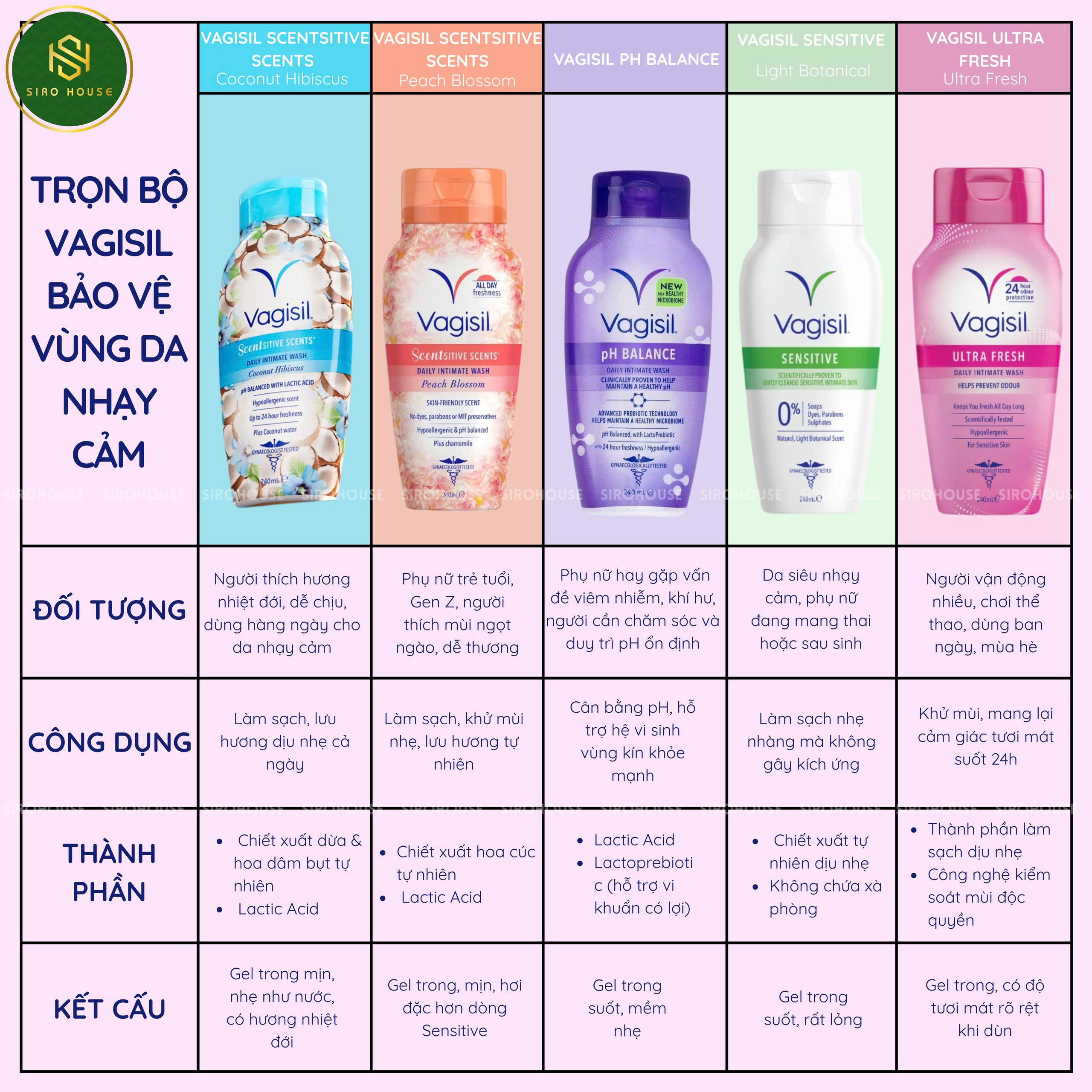 • Vagisil Sensitive: Công thức siêu dịu nhẹ, phù hợp cho làn da nhạy cảm, dễ kích ứng.
