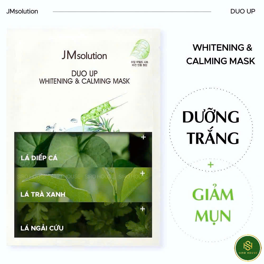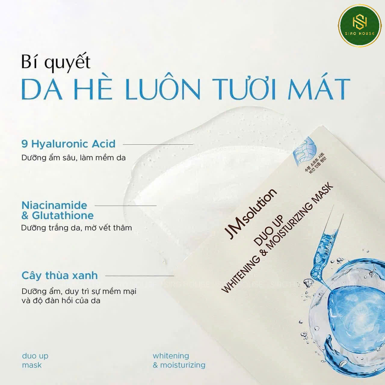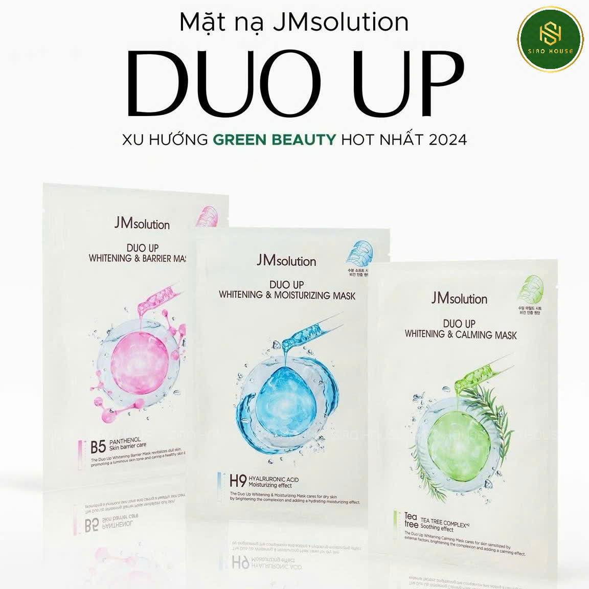 Mặt nạ dưỡng da JMSOLUTION Duo Up 30mL là dòng sheet mask cao cấp từ thương hiệu JMSolution (Hàn Quốc), chuyên biệt cho nhu cầu làm sáng da kết hợp chăm sóc chuyên sâu. Bao gồm ba phiên bản: B5 Whitening & Barrier (tăng cường hàng rào bảo vệ với Panthenol), H9 Whitening & Moisturizing (cấp ẩm sâu với 9 loại Hyaluronic Acid), và Tea Tree Whitening & Calming (làm dịu da mụn với chiết xuất trà xanh). Mỗi mặt nạ chứa 30ml essence đậm đặc, sử dụng sheet cellulose thân thiện, dễ bám dính, giúp da hấp thụ dưỡng chất tối ưu trong 15-20 phút. Phù hợp mọi loại da, đặc biệt da xỉn màu, khô hoặc nhạy cảm, sản phẩm mang lại làn da sáng khỏe, cân bằng mà không gây kích ứng.
