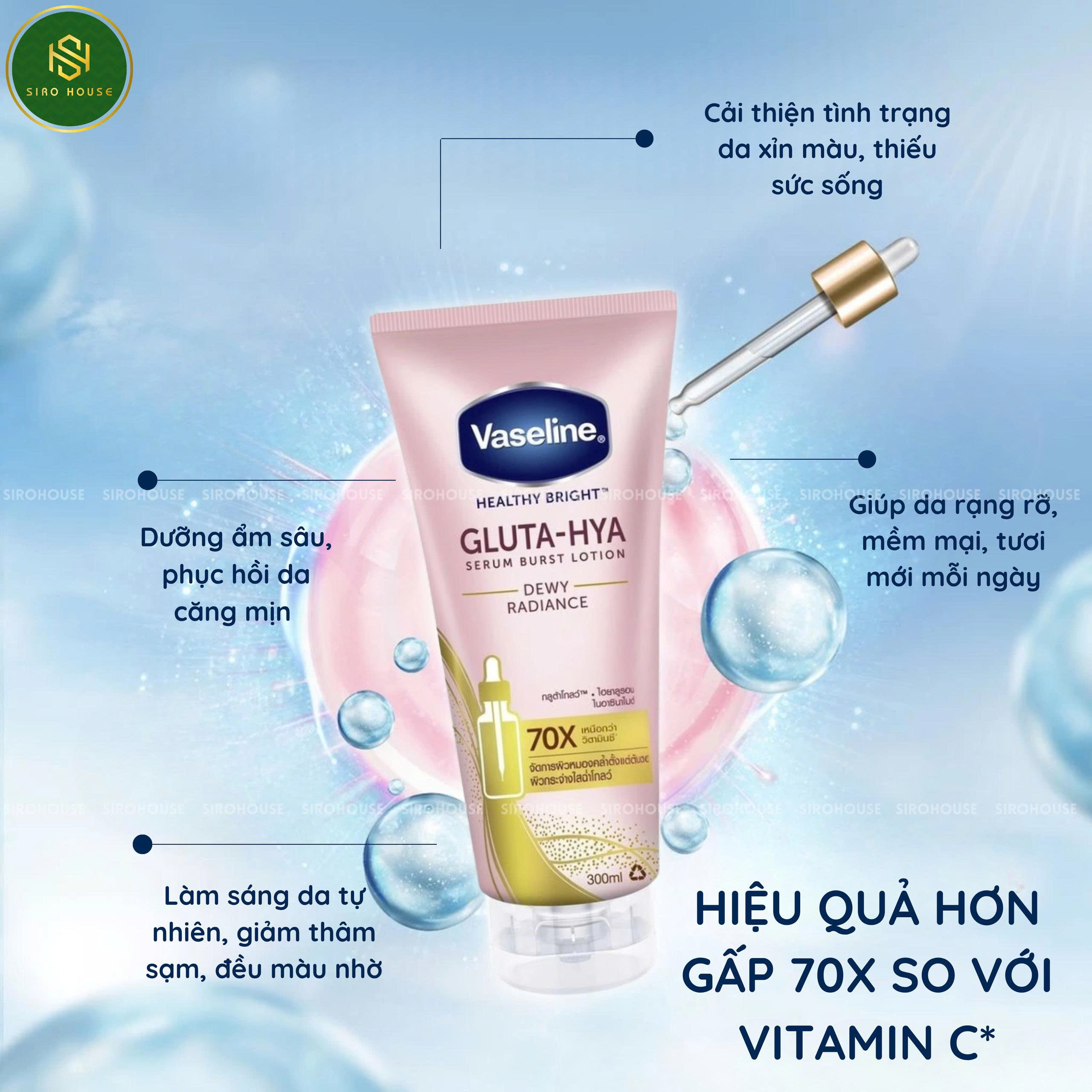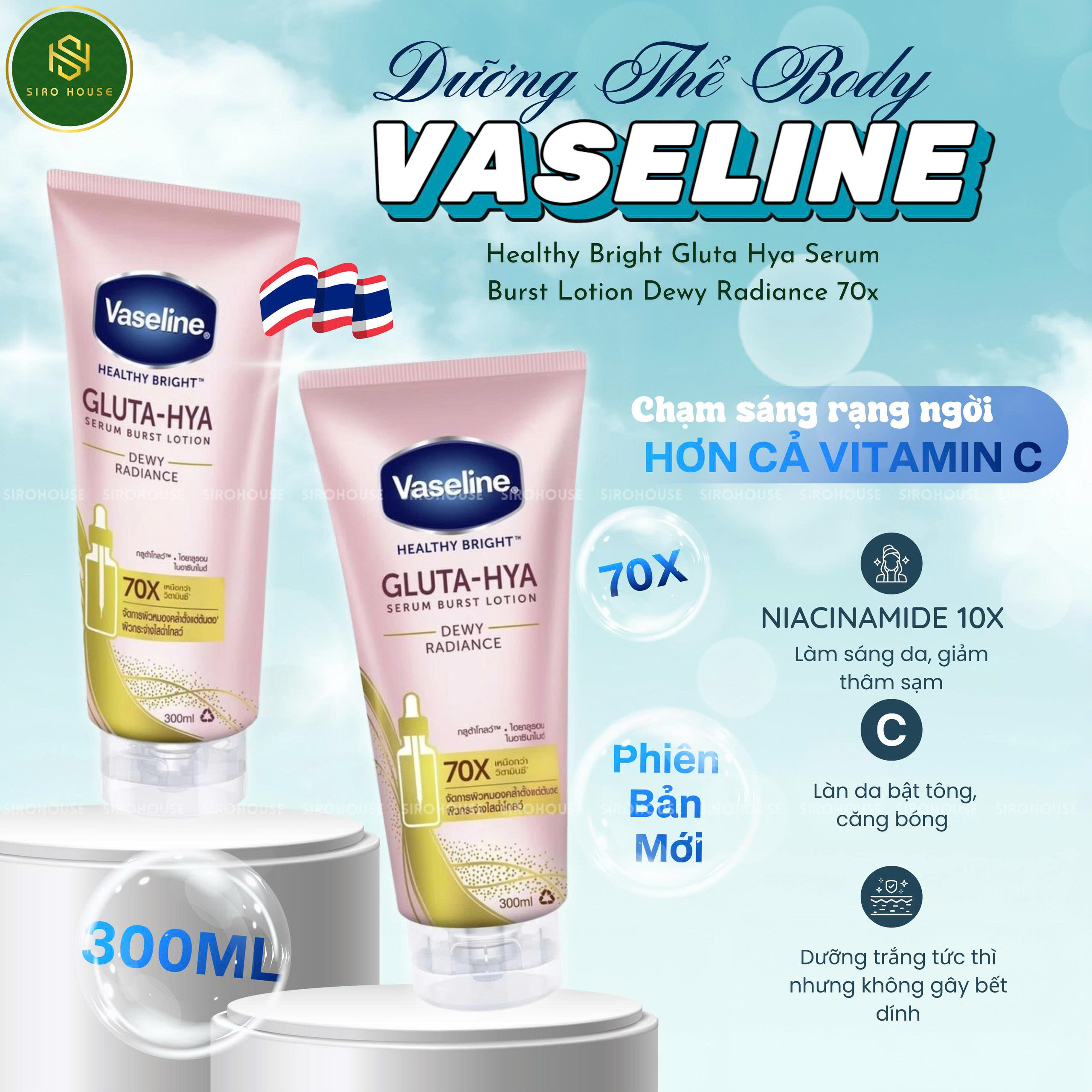 Vaseline là thương hiệu chăm sóc da nổi tiếng toàn cầu, được tin dùng tại hơn 60 quốc gia với các sản phẩm dưỡng ẩm, phục hồi và bảo vệ da vượt trội. Sữa dưỡng thể Vaseline Gluta-Hya Dewy Radiance 70X mang đến bước tiến mới trong chăm sóc da, kết hợp giữa công nghệ GlutaGlow với Hyaluronic Acid, giúp da sáng khỏe rạng rỡ và ẩm mượt như “ngậm nước”. Công thức dưỡng trắng mạnh gấp 70 lần vitamin C*, hỗ trợ cải thiện sắc tố da tối màu và mang lại làn da đều màu, căng bóng.