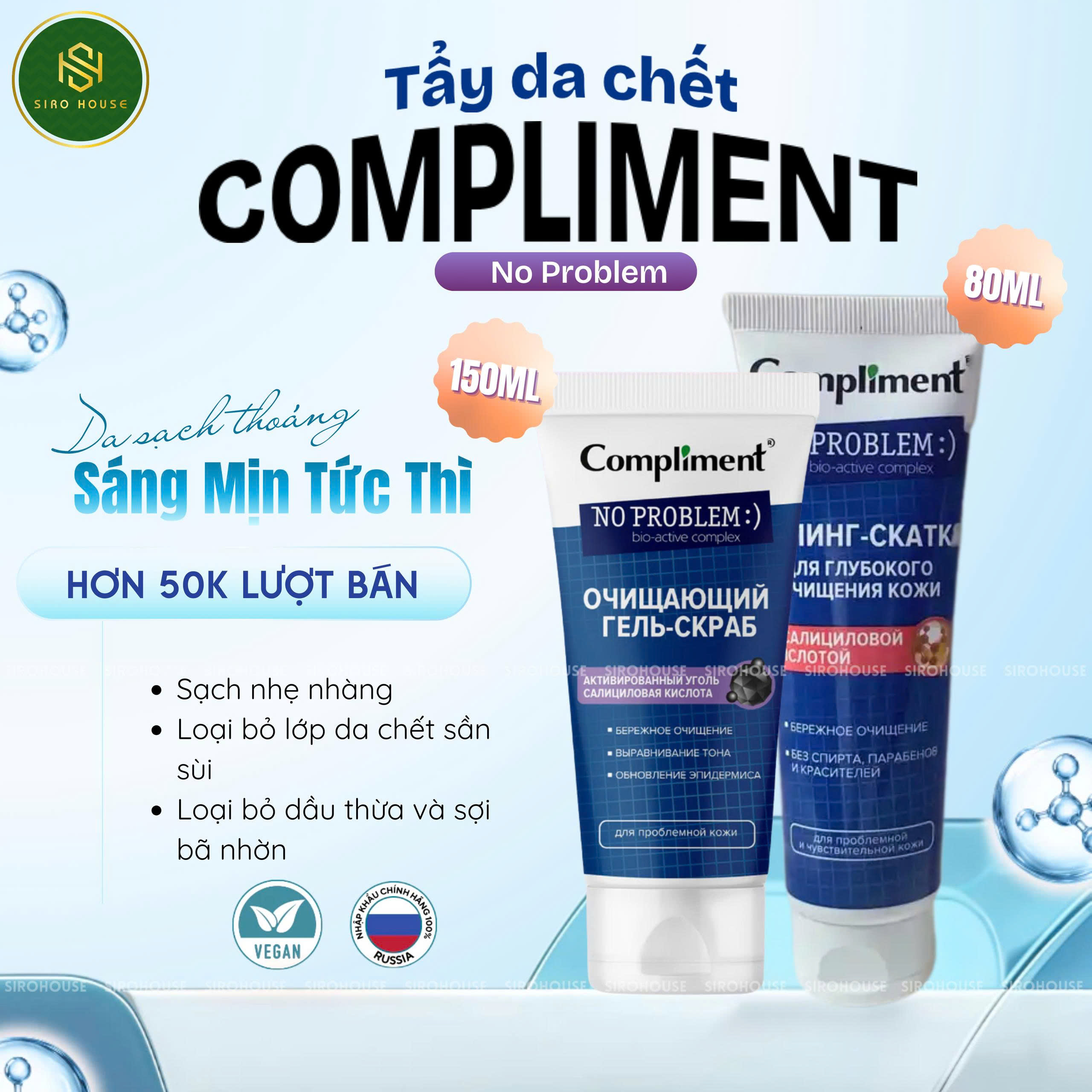 Dòng sản phẩm tẩy da chết COMPLIMENT No Problem được thiết kế đặc biệt cho da dầu, da mụn và da dễ bí tắc lỗ chân lông. Với 2 dạng tẩy da chết khác nhau – Gel Scrub dạng hạt và Peeling Roll dạng kì chứa Salicylic Acid, sản phẩm giúp làm sạch sâu, loại bỏ tế bào chết, giảm nguy cơ hình thành mụn và mang lại làn da thông thoáng, mịn màng.